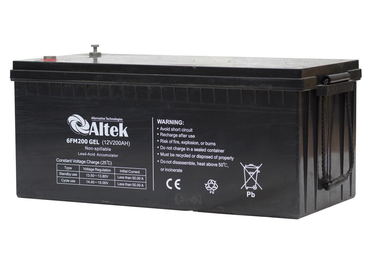 Акумуляторна батарея гелева Altek ABT-200Аh/12V GEL – Основна відмінність гелевої батареї від звичайної олив’яно-кислотної стартерної батареї в складі екектроліту. Електроліт гелевої батареї — це тиксотропний гель, який складається із суміші сірчаної кислоти, колоїдного діоксиду кремнію, води та фосфорної кислоти. Гелева батарея має триваліший термін експлуатації, порівнюючи зі стартерними батареями, особливо у разі циклічних розрядів.