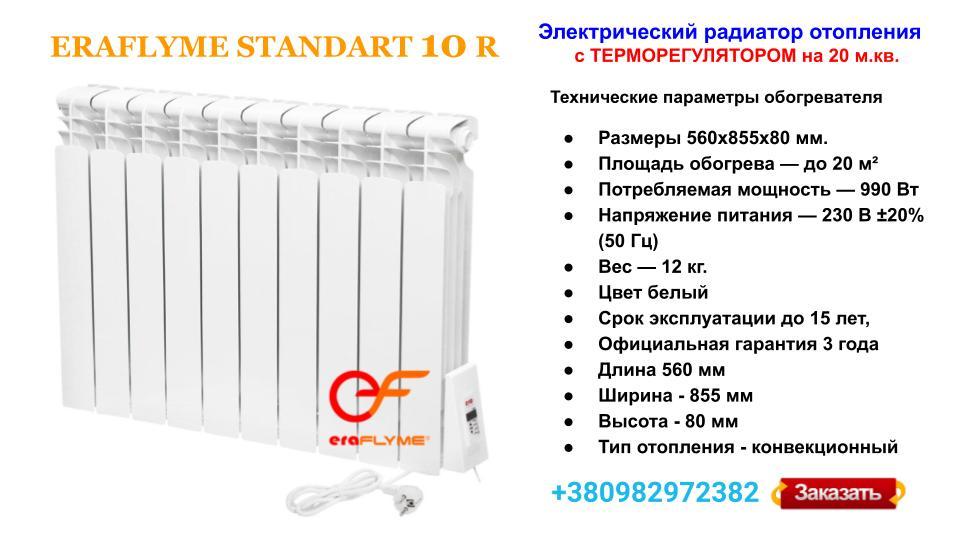 Електрорадіатор ERAFLYME STANDART 10R на 10 секцій, укомплектований якісним ТЕНом  та унікальним терморегулятором.