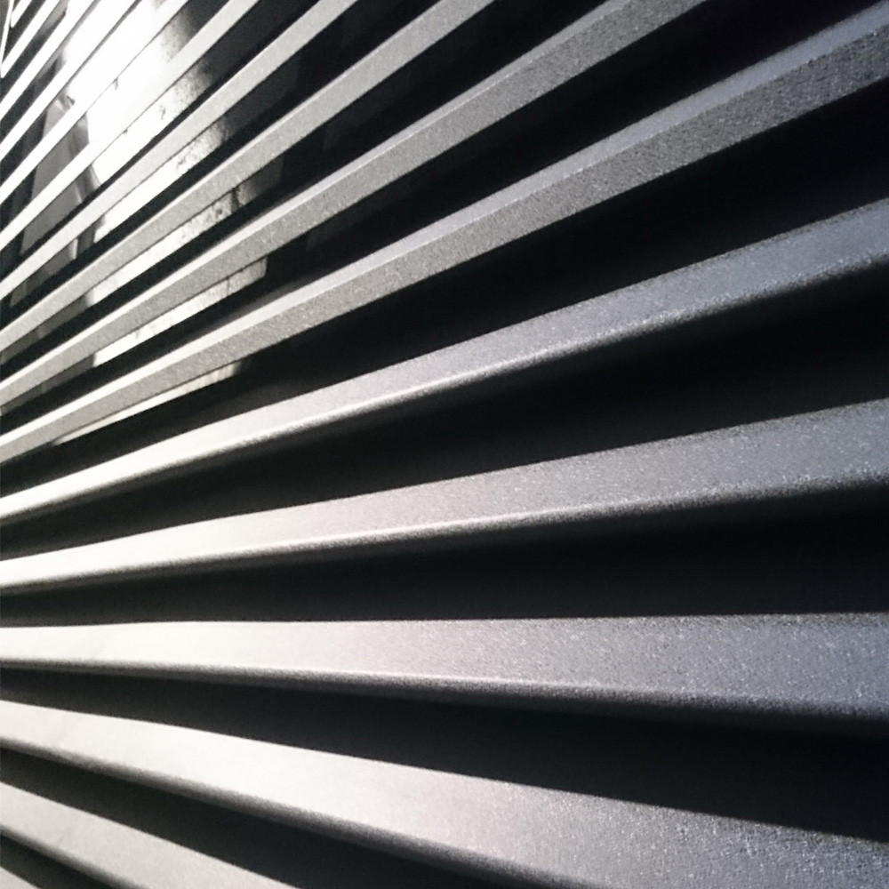 Забори жалюзі з оцинкованого металу з полімерним покриттям (одностороннім або двостороннім). Глянсовий або матовий поліестер, покриття printech — метал під дерево (темне дерево, 3D дуб, ясен, вільха). Товщина металу 0.45 мм.