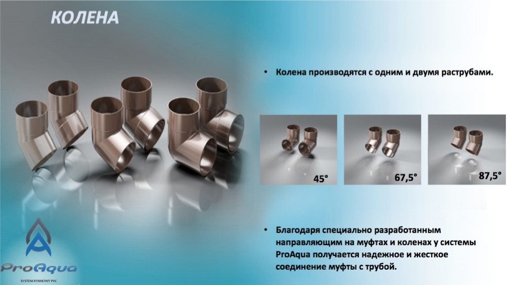 застосовується для обходу водостічної системи декоративних і архітектурних елементів фасаду будівлі, відведення води в сторону. Кут коліна 67,5°.