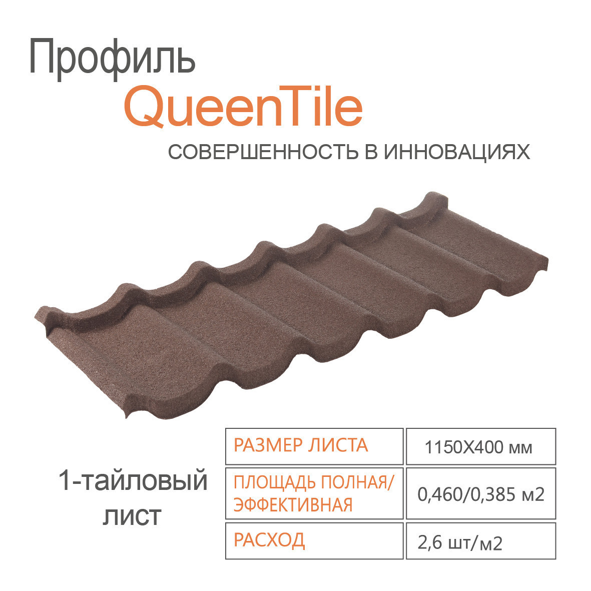1-тайловий профіль QueenTile® Brown – формат композитної черепиці, що являє собою одну хвилю завдовжки й шість повних хвиль + монтажний замок завширшки. Виразну геометрію цьому профілю надає високий ступінь хвилі. Глибокий насичений коричневий колір — один із найпопулярніших у архітектурі та дизайні сучасного будівництва.