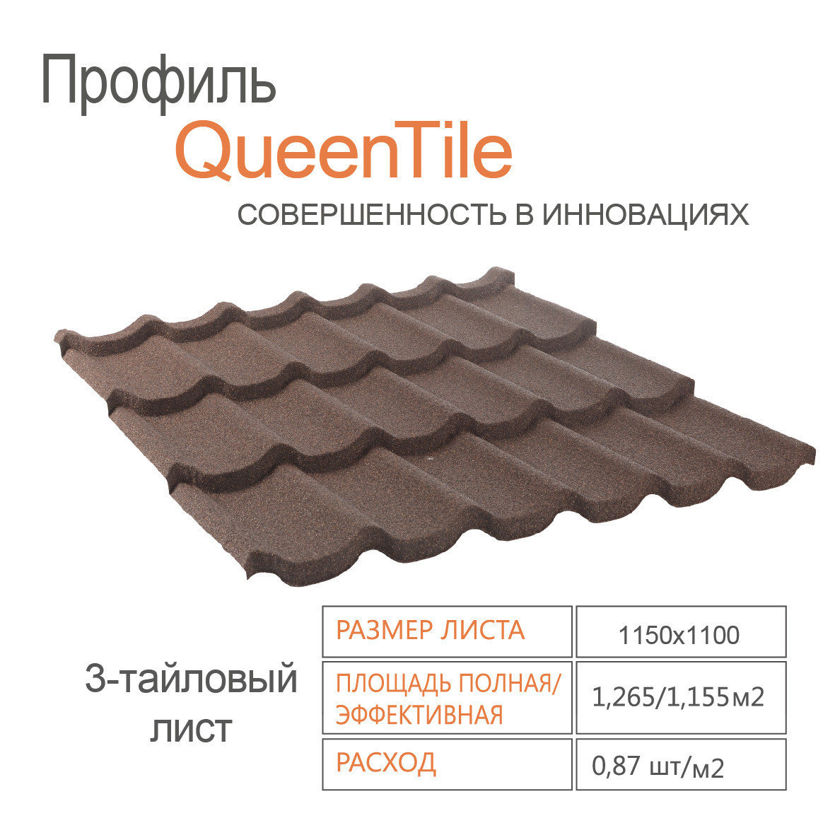 3-тайловий профіль QueenTile® Coffee – унікальний формат композитної черепиці, що являє собою три хвилі завдовжки й шість повних хвиль + монтажний замок завширшки. Виразну геометрію цьому профілю надає високий ступінь хвилі. Колір Coffee — відтінок коричневого, розбавлений світлими домішками розсипаними по всій площині тайлу — немов пінка на темній поверхні, щойно звареного ароматного напою.