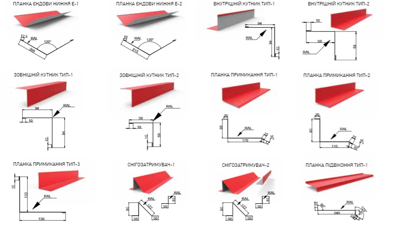 Наша компанія пропонує повний комплект елементів за привабливими цінами, необхідних для правильного монтажу та тривалої експлуатації вашої покрівлі. Саме вони нададуть їй досконалий і закінчений вигляд.
