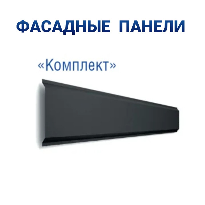 Фасадна панель “Комплект” має трапецієподібну форму з корисною шириною панелі 362 мм. Монтаж панелі здійснюється саморізом з ущільнювачем під колір панелі має видимий шов завширшки 19 мм. Максимальна довжина панелі 4 метри. Повна комплектація всіма добірними елементами для цих фасадних панелей.