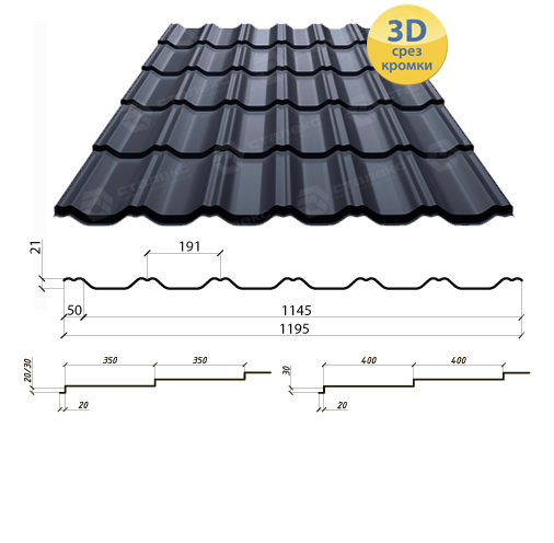 Металочерепиця “VALENCIA PEMA RAL 8019” Німеччина (350/20 0,50*1195)