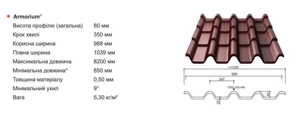 Металочерепиця Armorium — найкращий покрівельний профіль класу люкс на сучасному ринку. Ця металочерепиця запорука довговічності, повністю відповідає наявним стандартам, має всі необхідні характеристики елітних матеріалів, високі протикорозійними якості абсолютної вогнетривкості, завидної водостійкості.