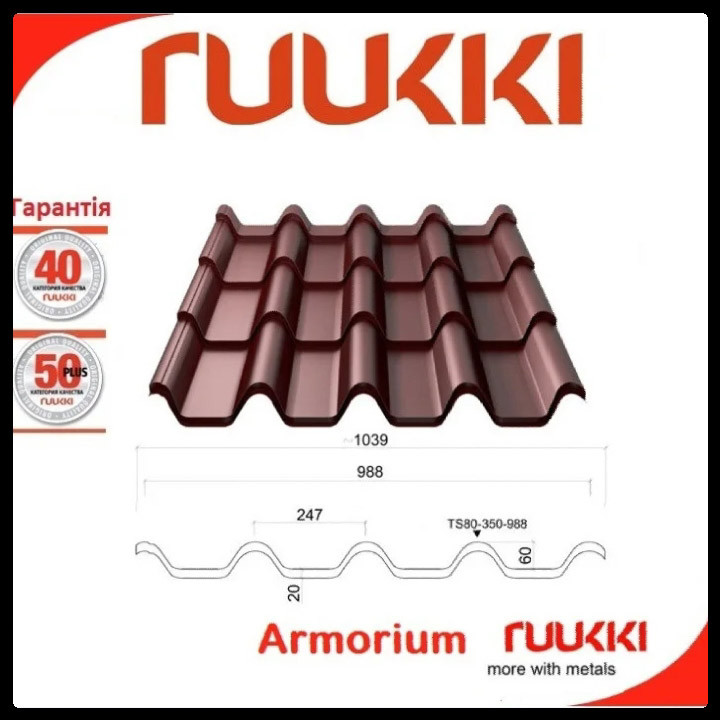 Металочерепиця “Ruukki Armorium” 50 plus | Pural matt ⁇ RR 887 шоколадно-коричневий ⁇ замовити в Києві.
