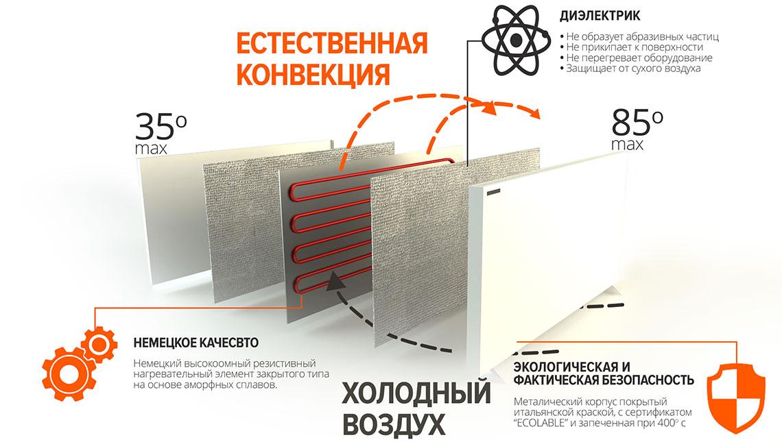 Металевий корпус на лицьовій стороні якого розташований високоомний резистивний елемент випромінює приємне інфрачервоне випромінювання, яке нагріває насамперед предмети та нагрівається до своєї робочої температури за 5-7 хвилин. Всередині нагрівача відбувається природна конвекція повітря холодне повітря через конвекційні решітки прогрівається також, завдяки чому досягнута максимальна енергоефективність і економічність панелі TermoPlaza. Нагрівач не сушить повітря на відміну від своїх побратимів електричних конвекторів — завдяки високоомному гумовому нагрівальному елементу, виробленому в Німеччині. Вбудований програмований терморегулятор дасть вам змогу задати комфортну температуру в приміщенні та максимально заощадити на оплати рахунків за електроенергію.