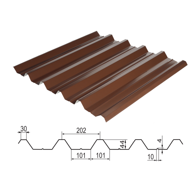 • Профнактил НС-44 найчастіше застосовується для покрівельних покриттів (скатних дахів) промислових і цивільних будівель, з невеликими кутами ухилу або в конструкціях із великими відстанями між прогонами, не втрачаючи його здібностей проти опору сніговим і вітровим навантаженням.