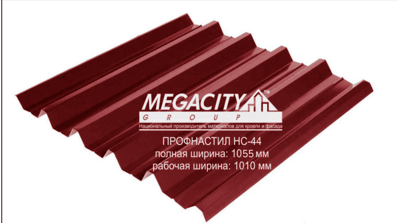 , що несе — це не несе профнастил із полімерним покриттям поліестер глянсовий, за класифікацією RAL — 3011, червоний, товщина металу 0,45 мм. Профнактил С-44 найчастіше застосовується для покрівельних покриттів (скатних дахів) промислових і цивільних будівель, з невеликими кутами ухилу або в конструкціях із великими відстанню між прогонами, не втрачаючи його здібностей проти снігу та вітровим навантаженням.