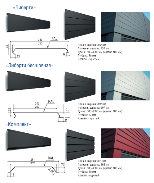фасадні панелі “Ліберті” виробляються тільки зі сталі завтовшки 0,5 мм у покриттях поліестер і матполіестер великий палітрі квітів RAL.