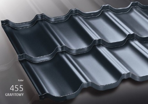 Модульна черепиця Venecja виробництва компанії BudMat (Польща) у покритті X-Matt сірого кольору, номер відтінку 455. Виготовлена з металу концерну SSAB (Швеція).