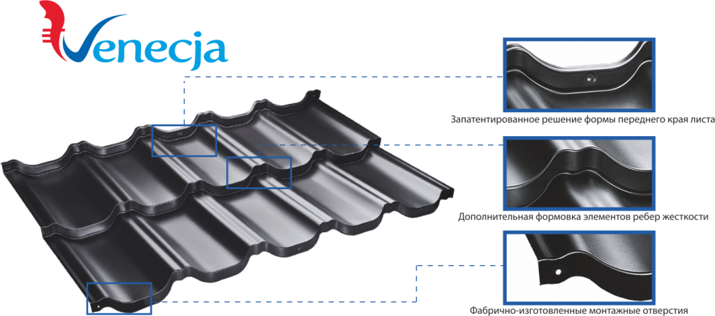 Гарні обриси поряд із ідеальною геометрією форми схожі на керамічну черепицю. Водночас Venecja вирізняється сучасним дизайном і ідеально підійде для покрівлі будь-якого об’єкта. Нетиічне дизайнерське рішення у формі 5 нижніх і 6 верхніх хвиль, а також кутів особливої форми, забезпечує ідеальне з’єднання модулів, що неабияк підвищує експлуатаційні характеристики.