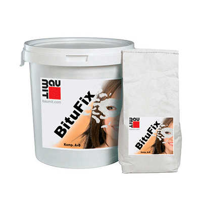 Baumit BituFix 2K двокомпонентна бітумна суміш для приклеювання XPS Еластична, двокомпонентна, армований волокнами, без розчинників, з чудовими адгезійними властивостями клейова суміш на бітумній основі Baumit BituFix 2K. Для зовнішніх і внутрішніх робіт, зручна в застосуванні, екологічно безпечна.